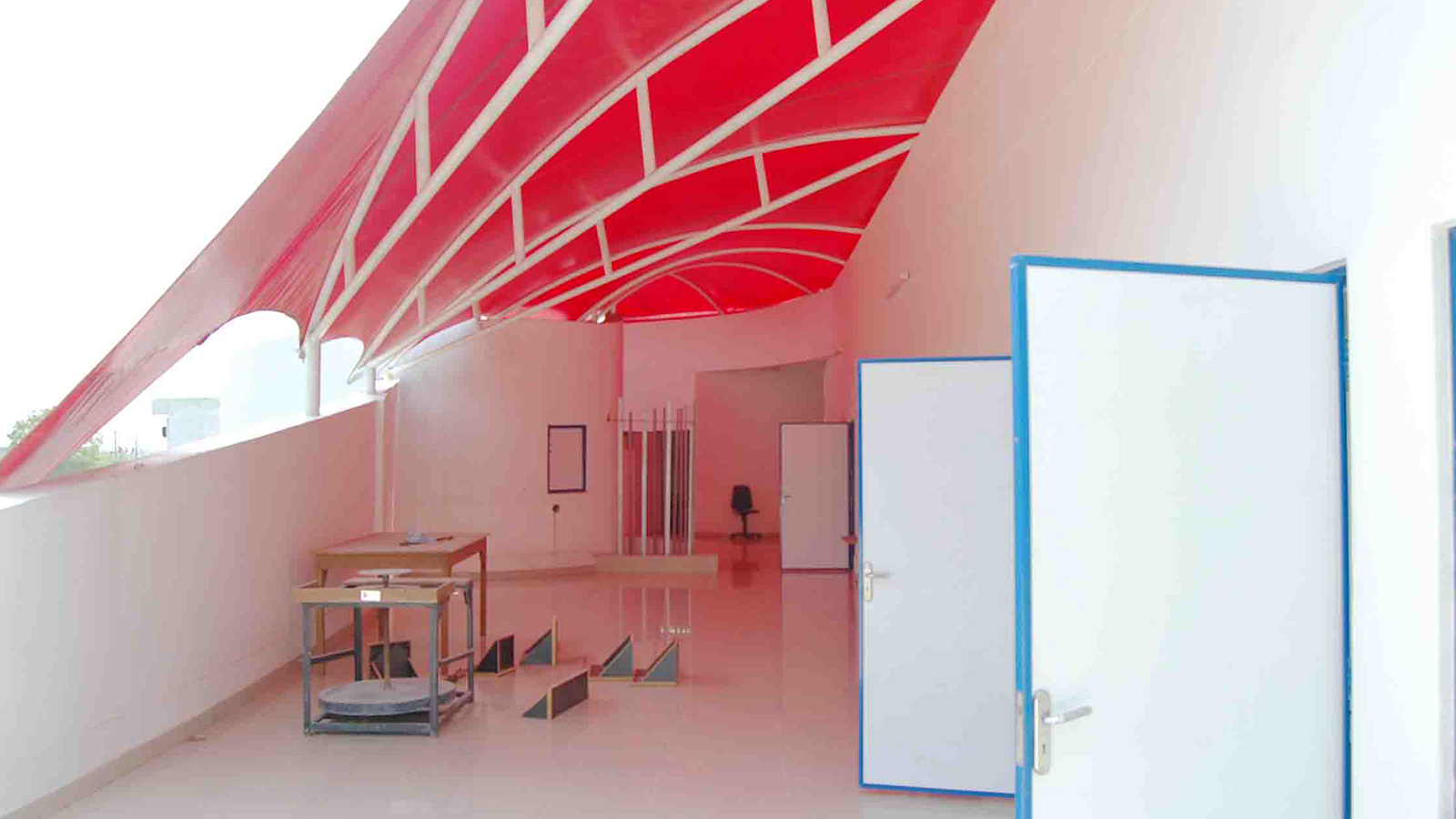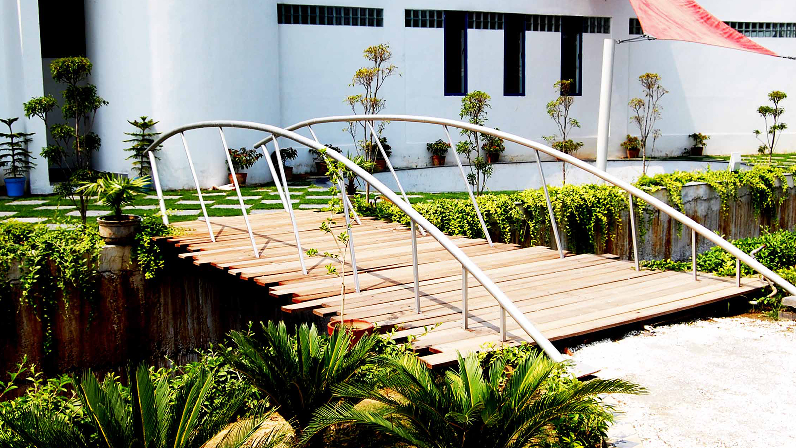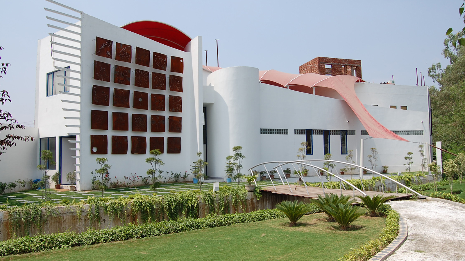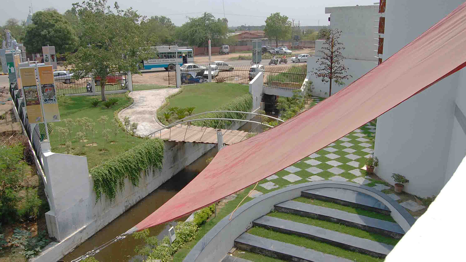 An irregular plot of land with a city drain going through it, was to be developed into a vocational centre to teach and inspire the young girls of the city. The brief was simple and so was the building that evolved. The section of nallah (drain) passing through the plot was transformed into a lotus pond and the building formed a backdrop to the green.