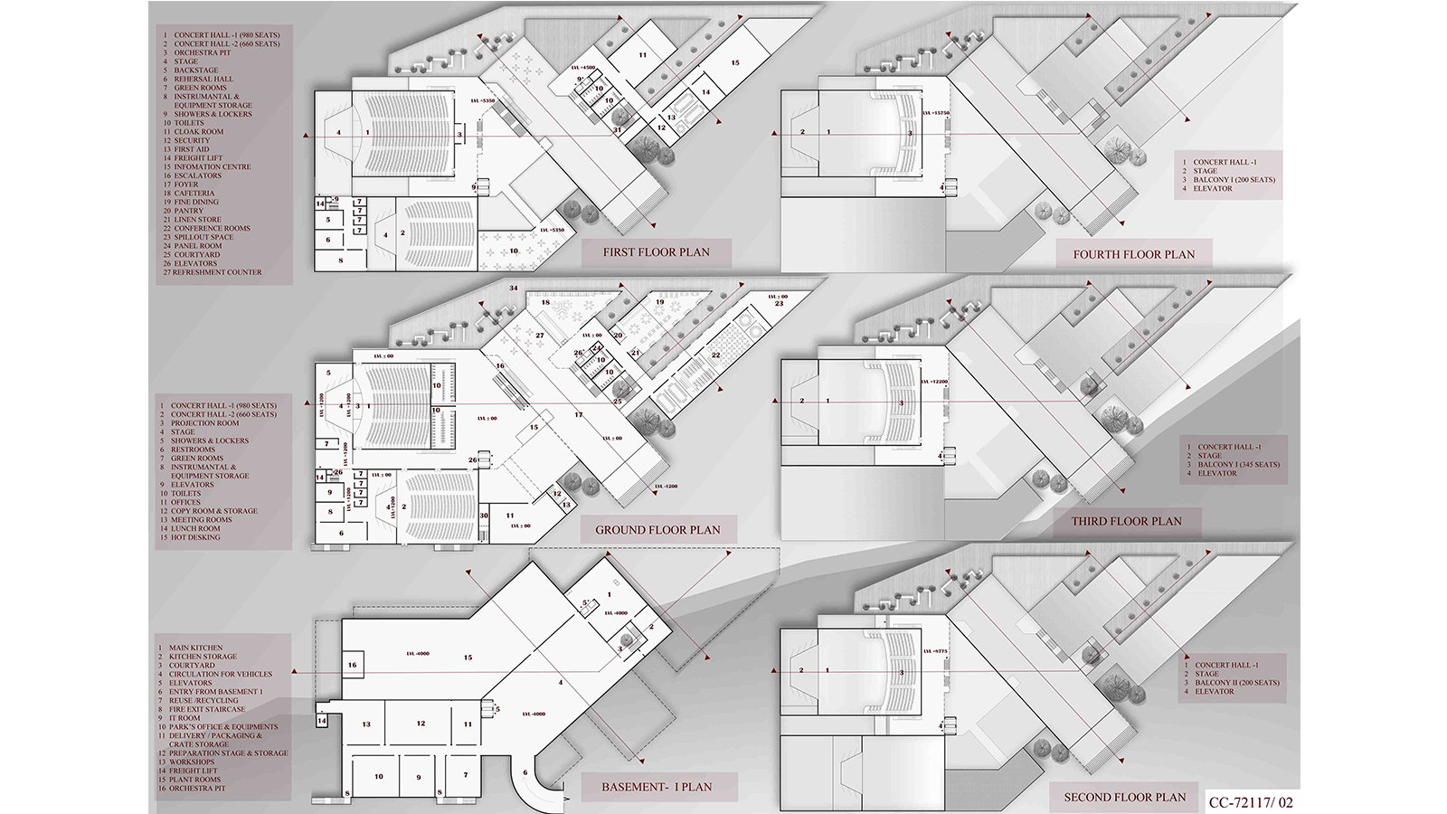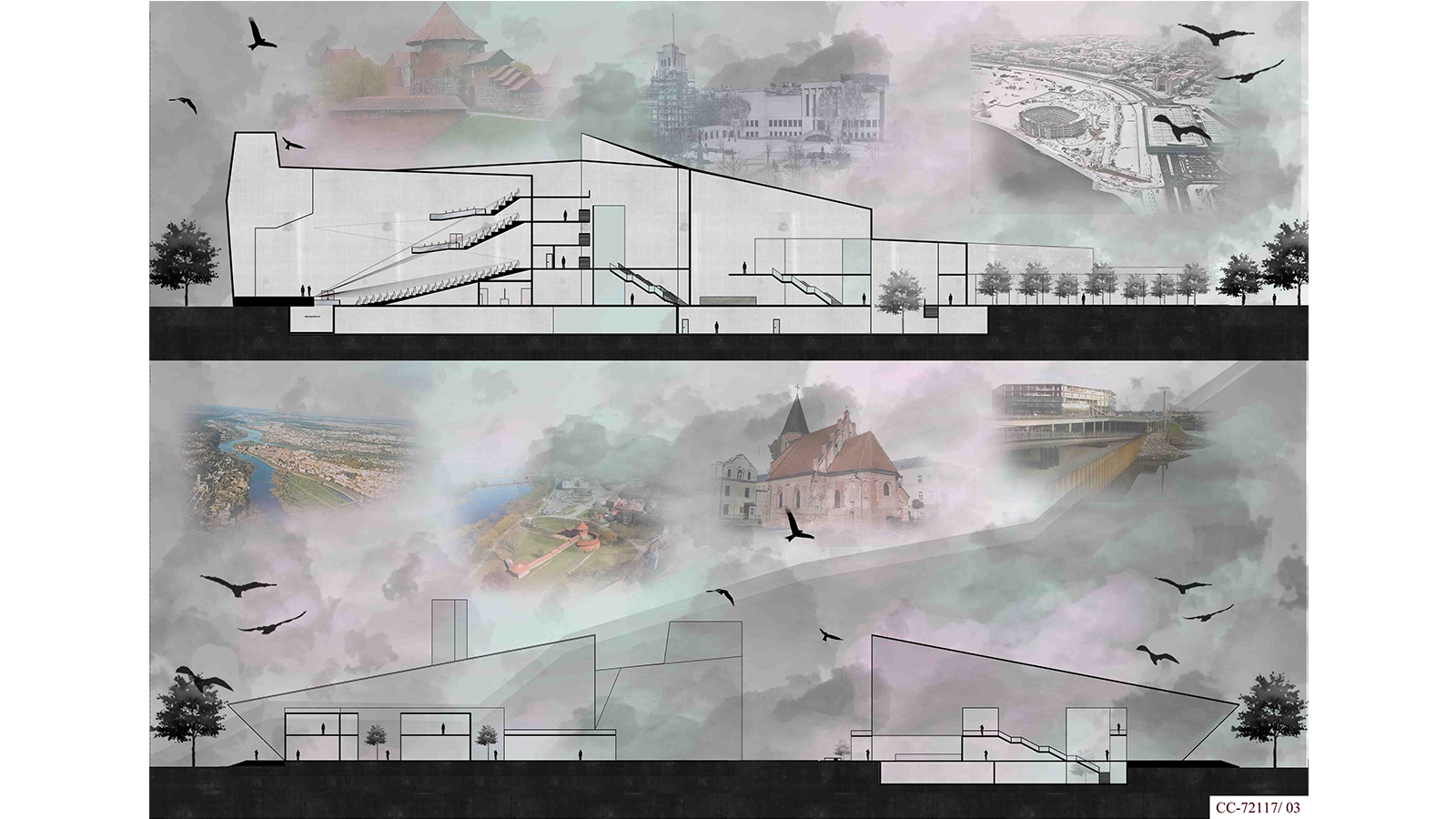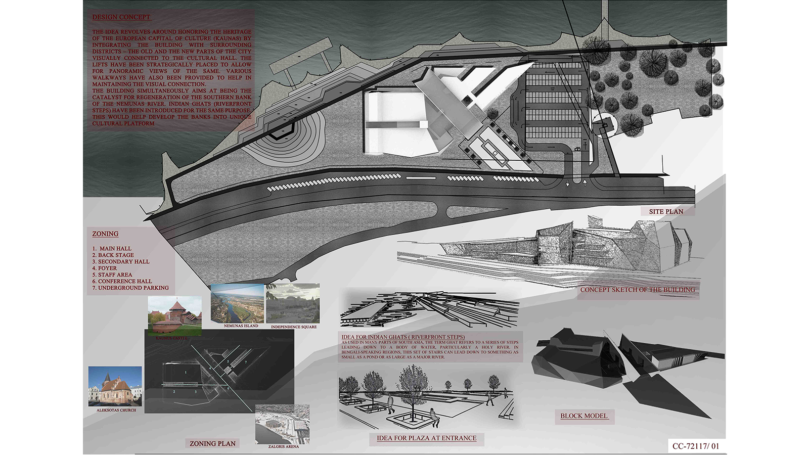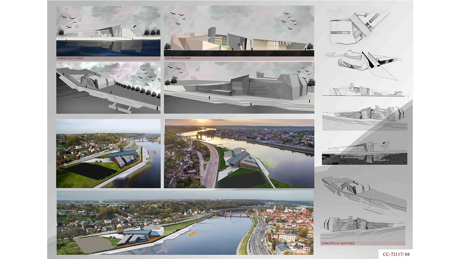 The idea revolves around honoring the heritage of the European Capital of culture (Kaunas) by integrating the building with surrounding districts – the oold and the new parts of the city visually connected to the cultural hall.