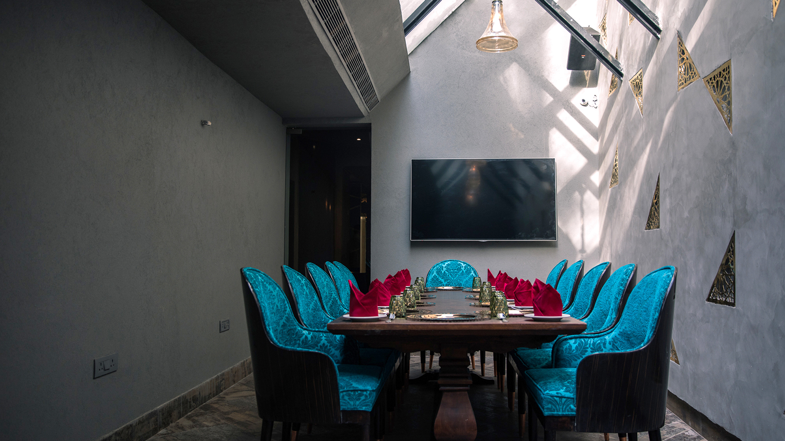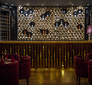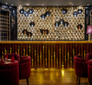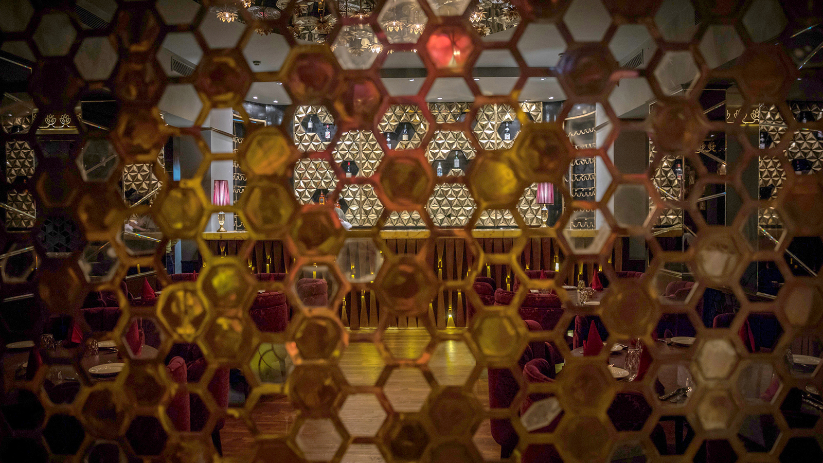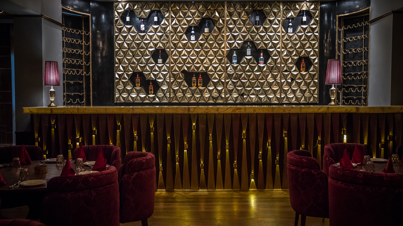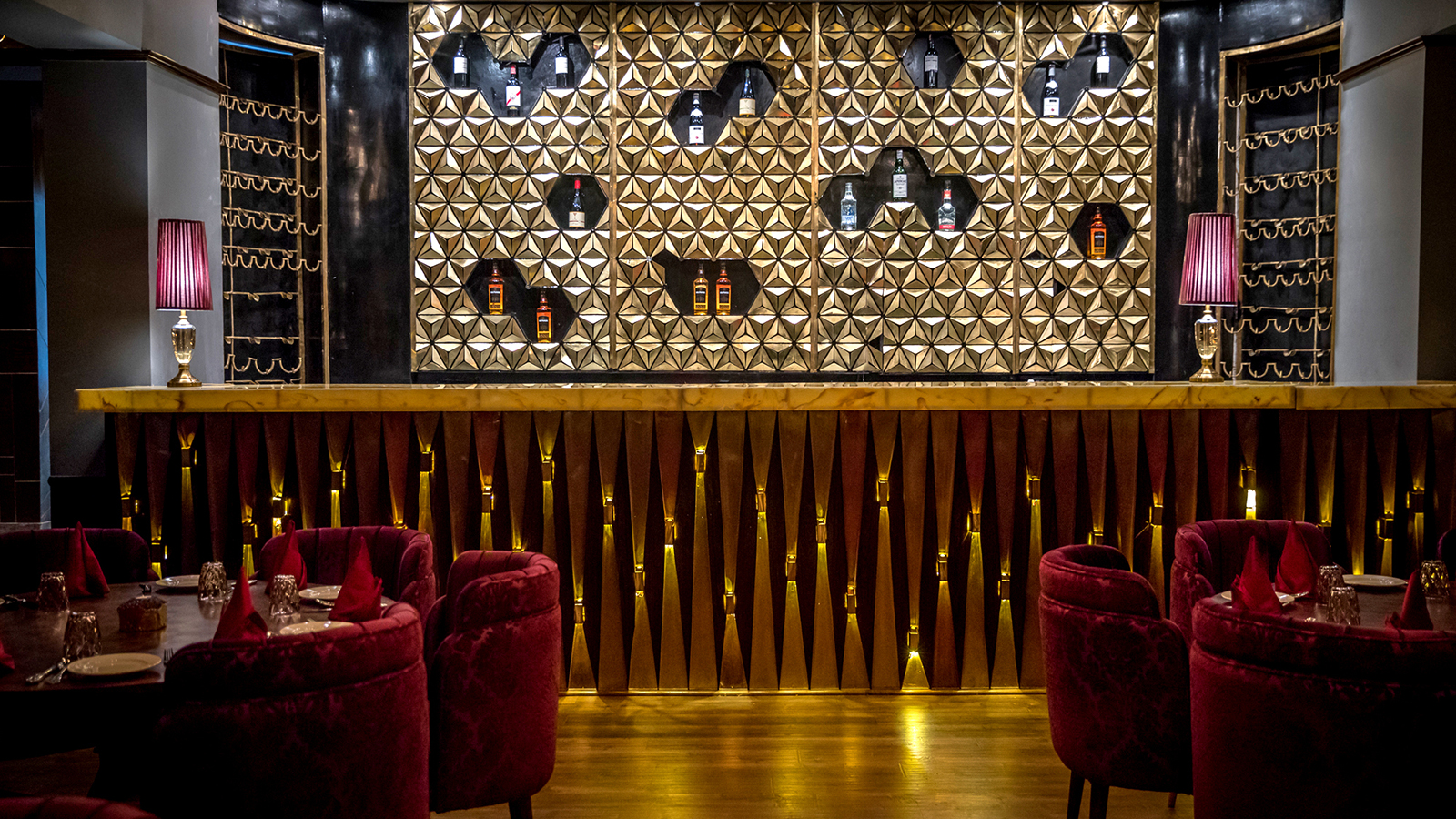The various installations inside and outside have been done with a motive of creating a harmonious spatial relationship in accordance with Indian roots. A Whimsical hexagonal Jali Installation at the entrance helps one see the space vaguely and the power of the space can be felt while standing outside. The Wine Cellar, The Bar, The Counter, The Walls all have been tiled according to the aesthetics.