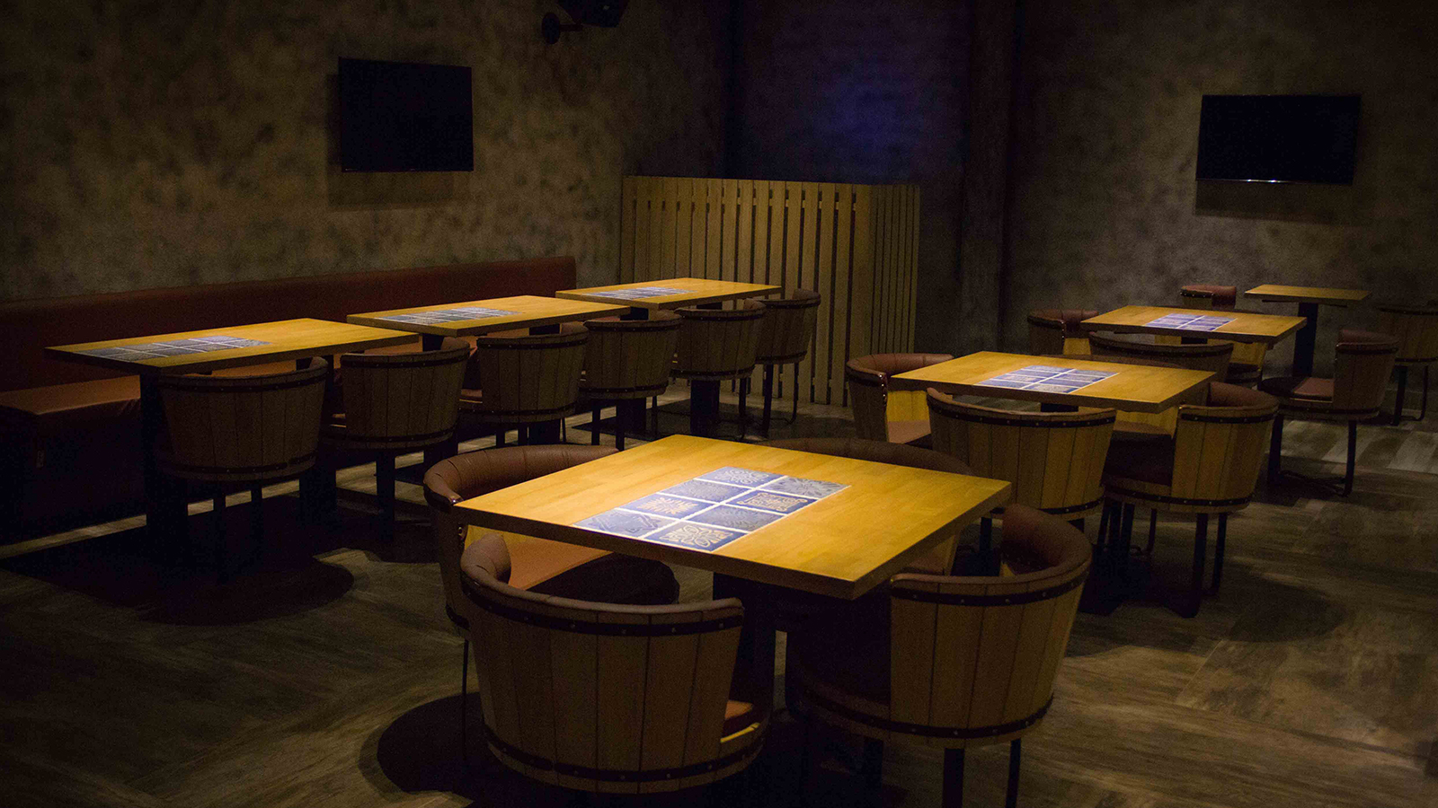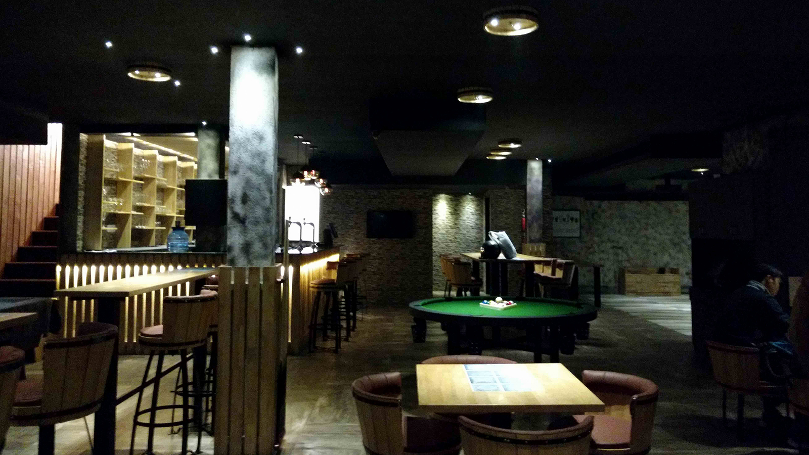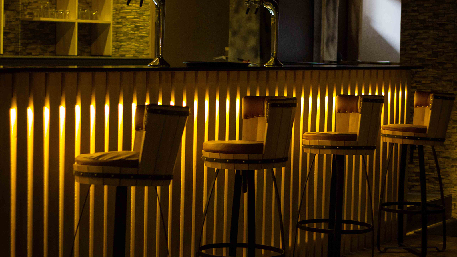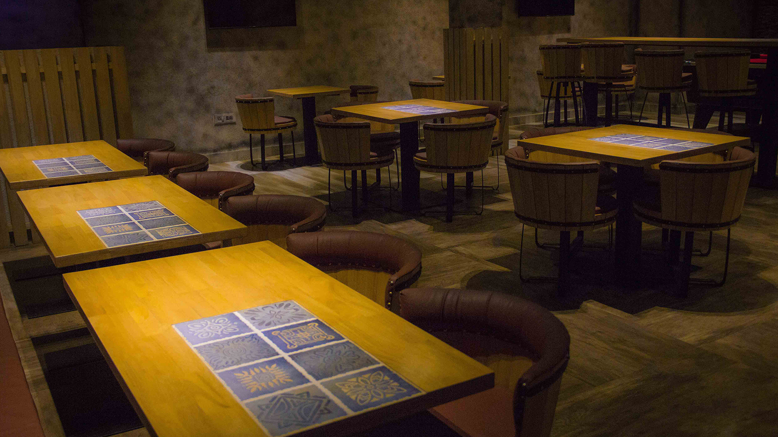 Rising Sports Bar situated in Punjabi Bagh, has been primarily designed in order to exaggerate the experience of sports altogether. The raw finish to it is achieved by wine barrels shaped chairs. Warmer tone helps the overall concept to accentuate various design interventions, furniture etc. Bar holds the holiness of the place by standing out in the scheme.
