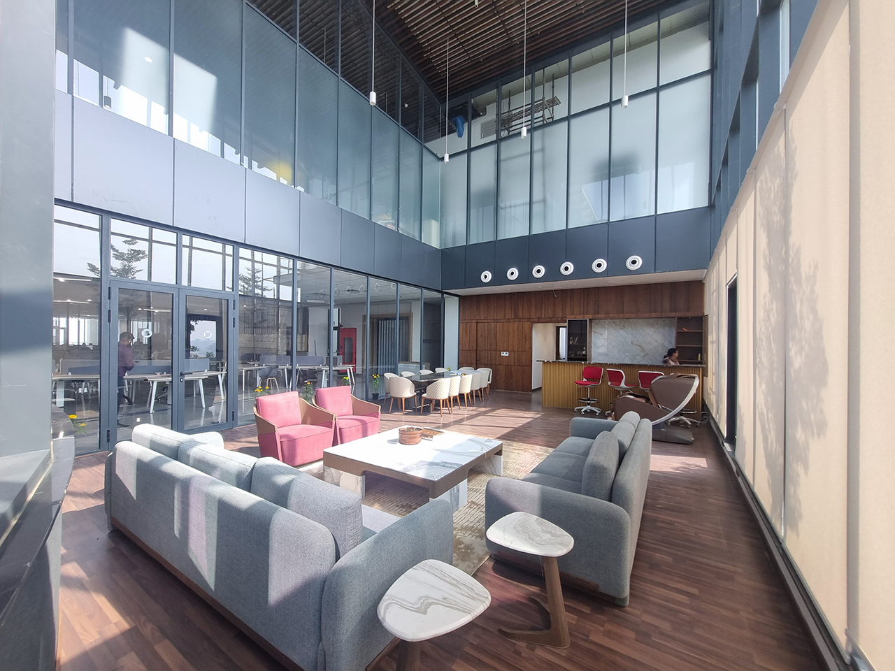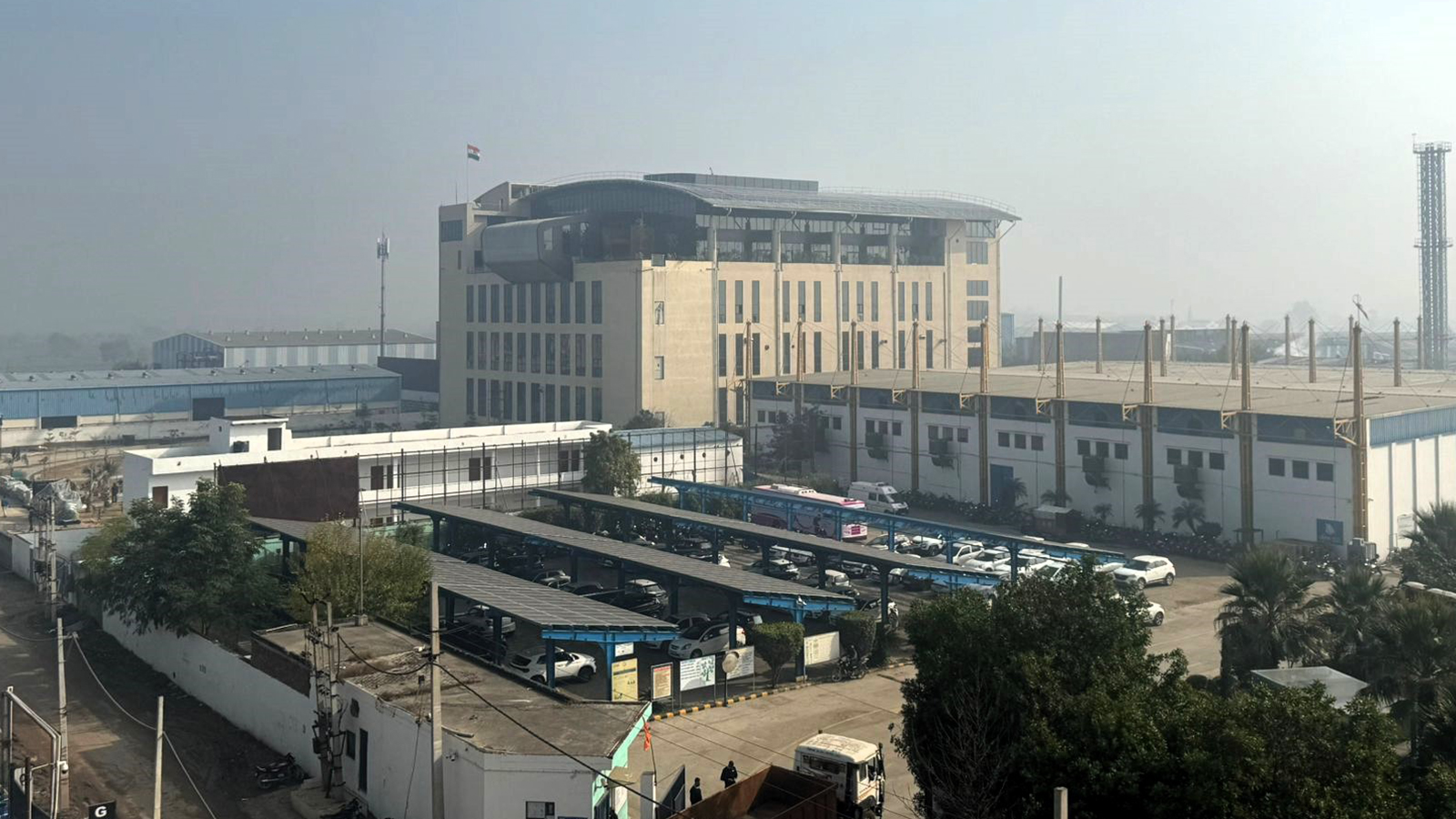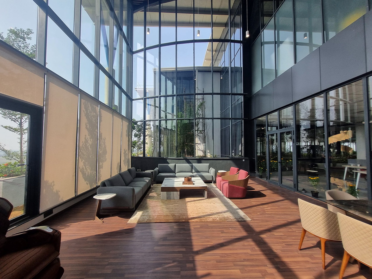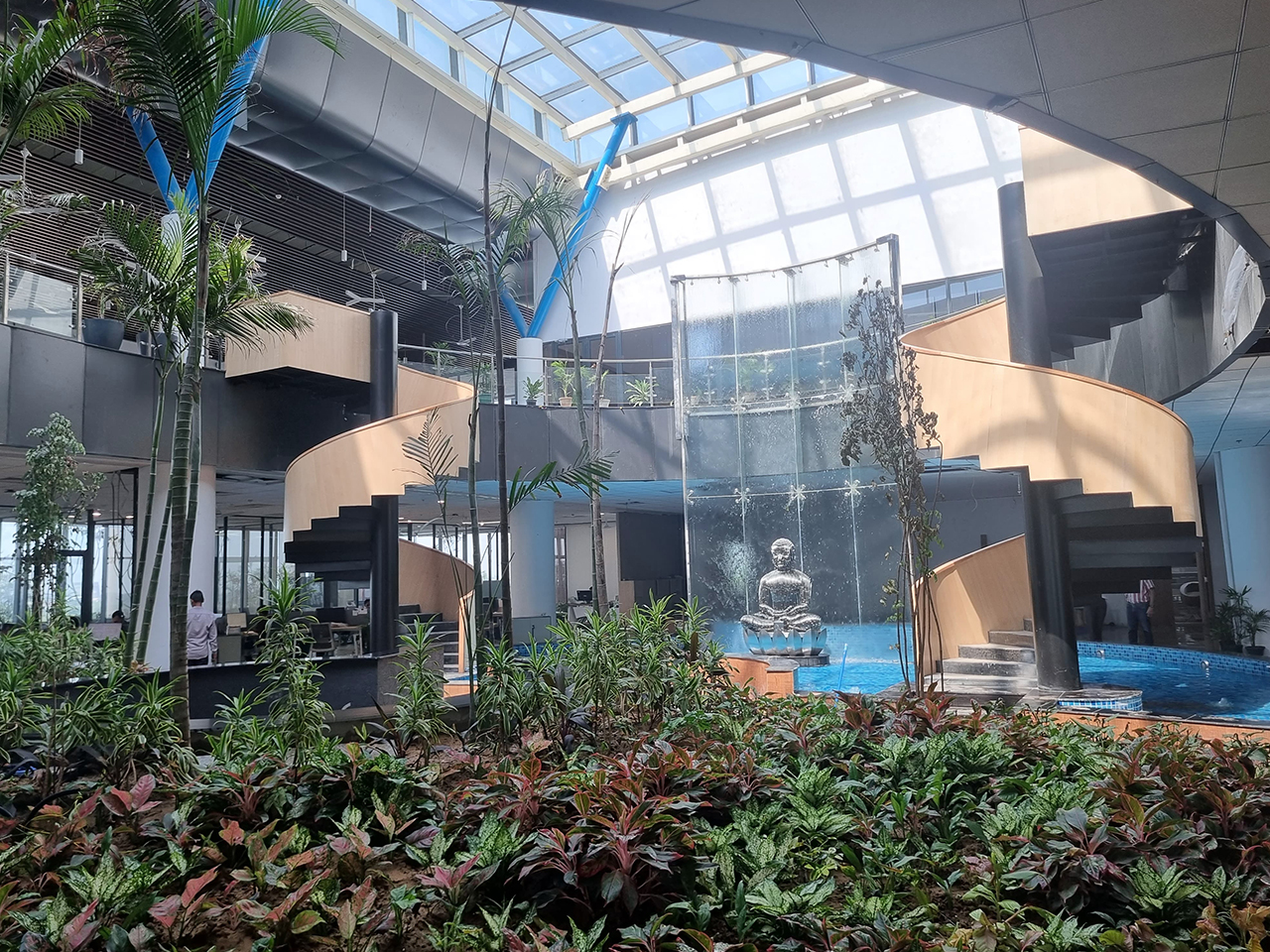 The two blocks of the building are set on either sides of a covered courtyard with a fish pond. It was conceived as a “Green Building, and designed to reduce heat gain and increase the penetration of natural day light into the work areas to minimize the use of artificial lighting.