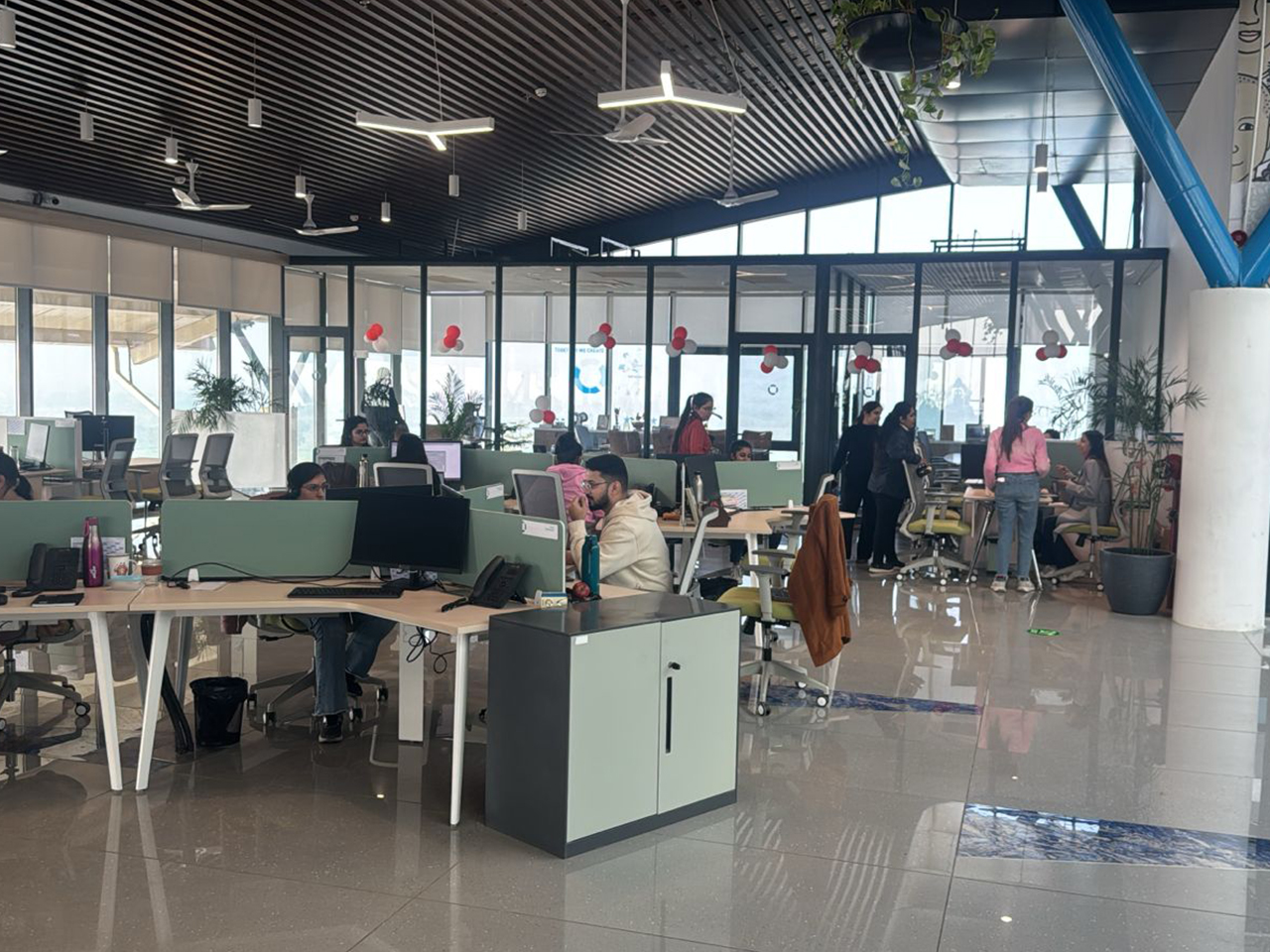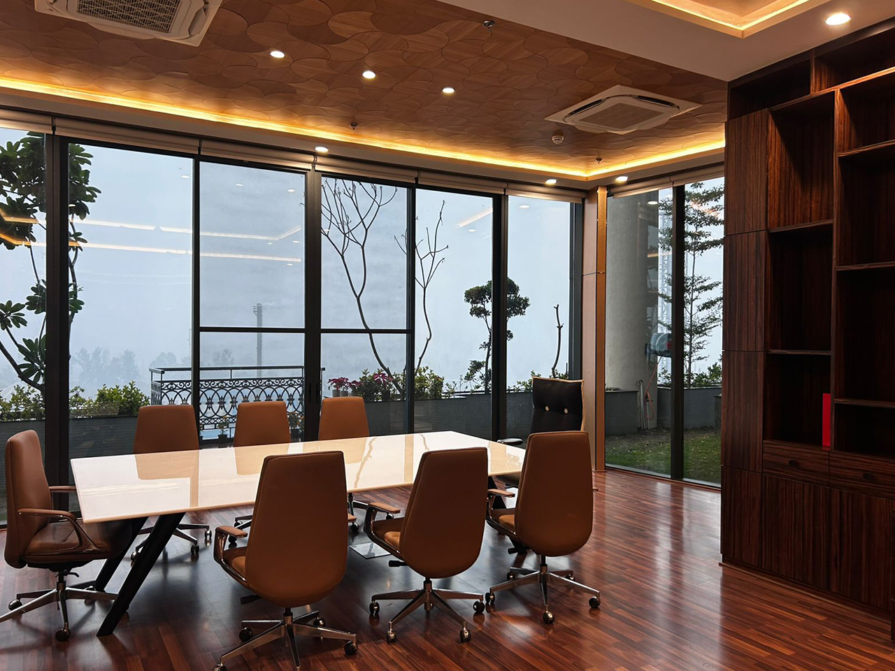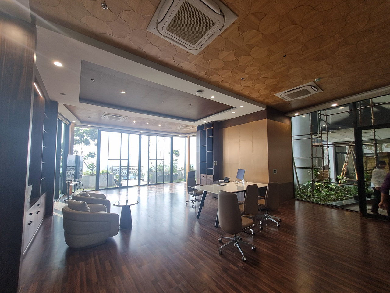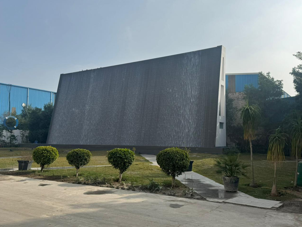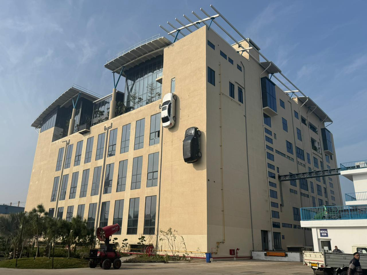 The two blocks of the building are set on either sides of a covered courtyard with a fish pond. It was conceived as a “Green Building, and designed to reduce heat gain and increase the penetration of natural day light into the work areas to minimize the use of artificial lighting.