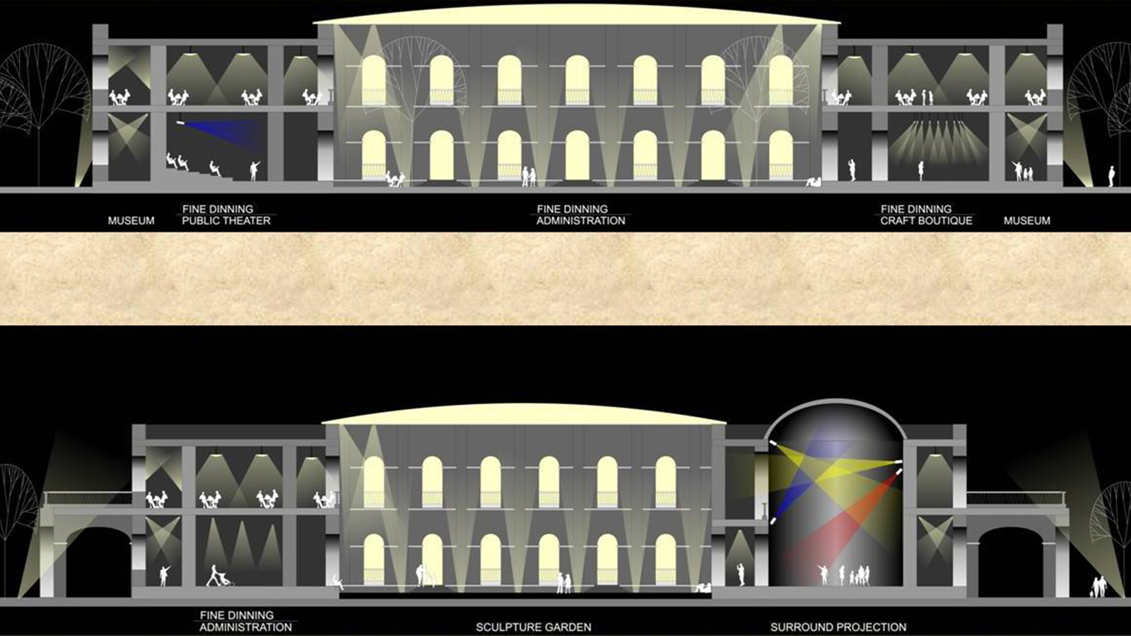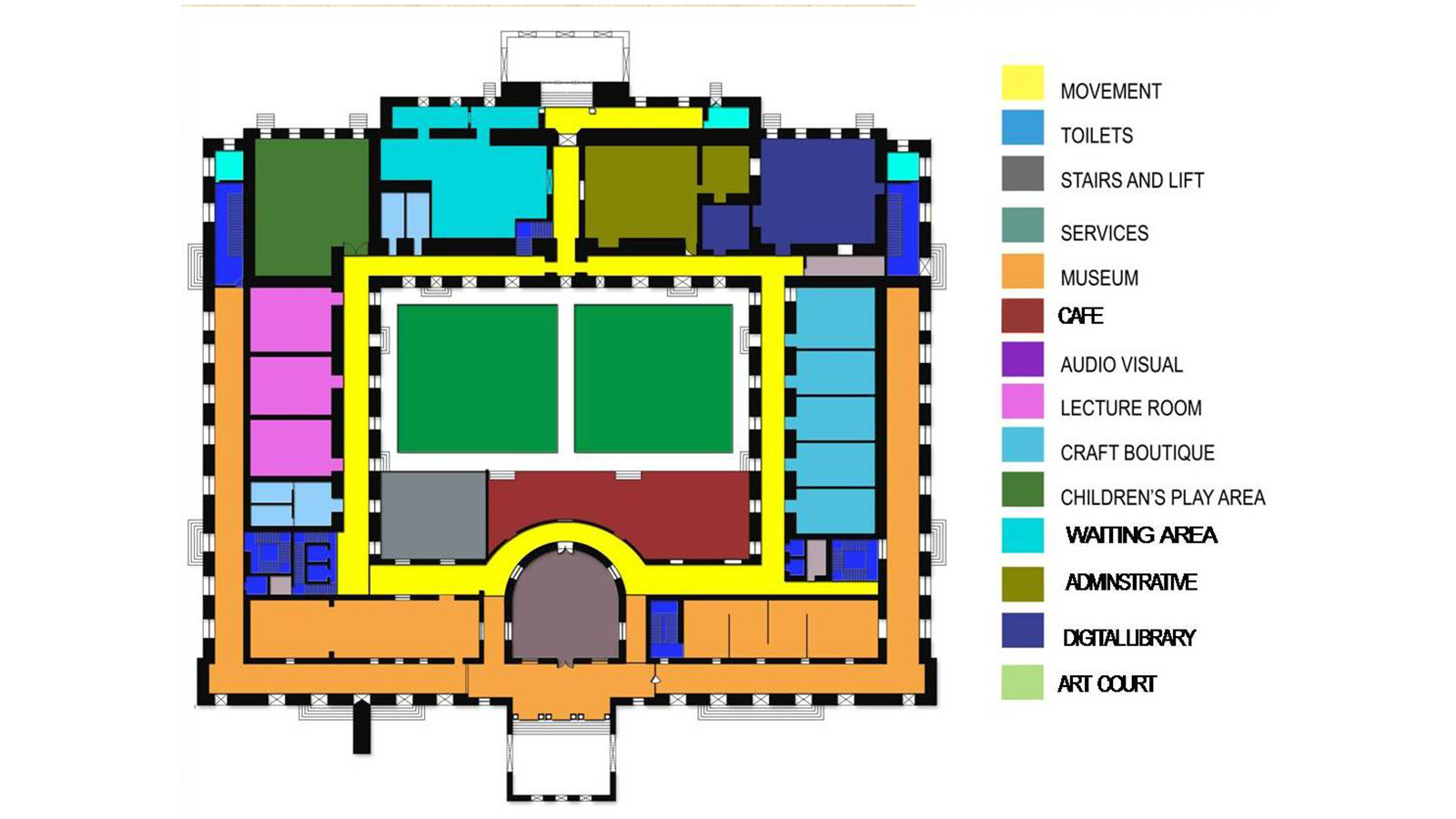 The overall concept was prepared keeping the original Architecture of the Town Hall intact and adding only what was necessary to convert it into a world class centre for cultural experience. An estimate for various components was drawn based on discussions with various consultants. It was proposed to launch it as a unique and a complete family experience for citizen of Delhi and tourist so that they can become familiar with history and culture of Delhi at one place with multifarious activities.
