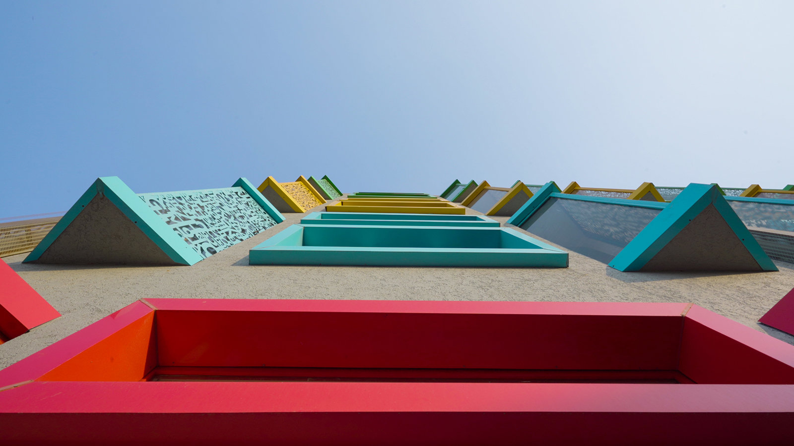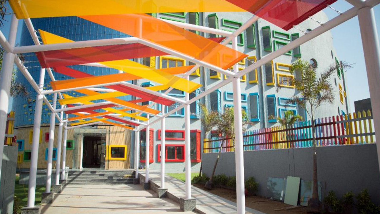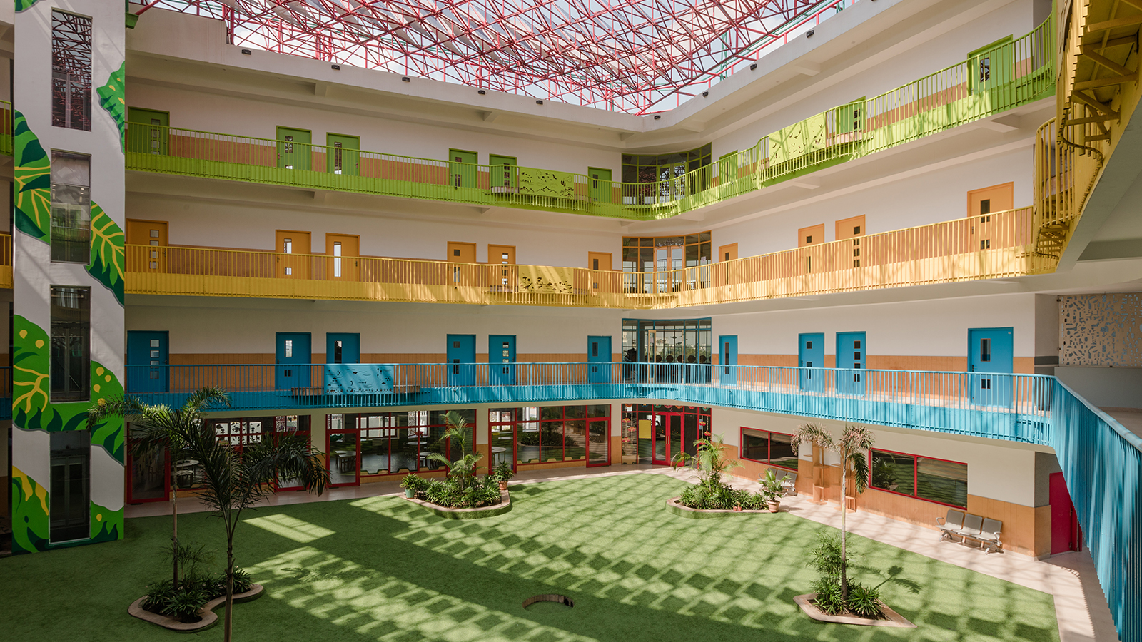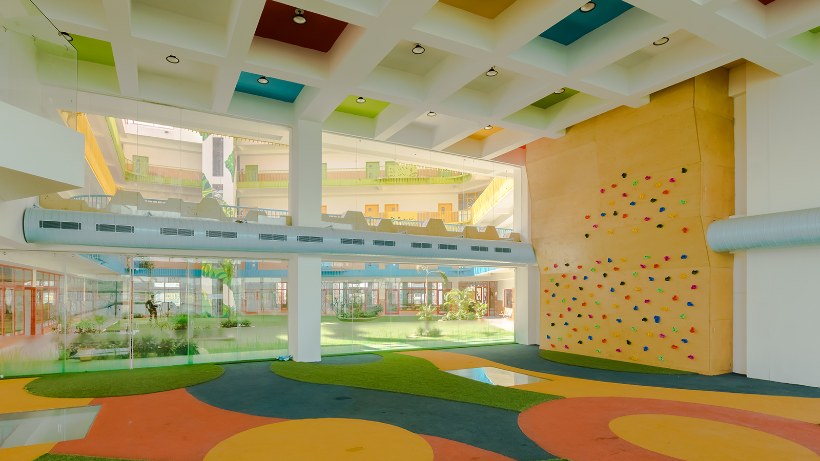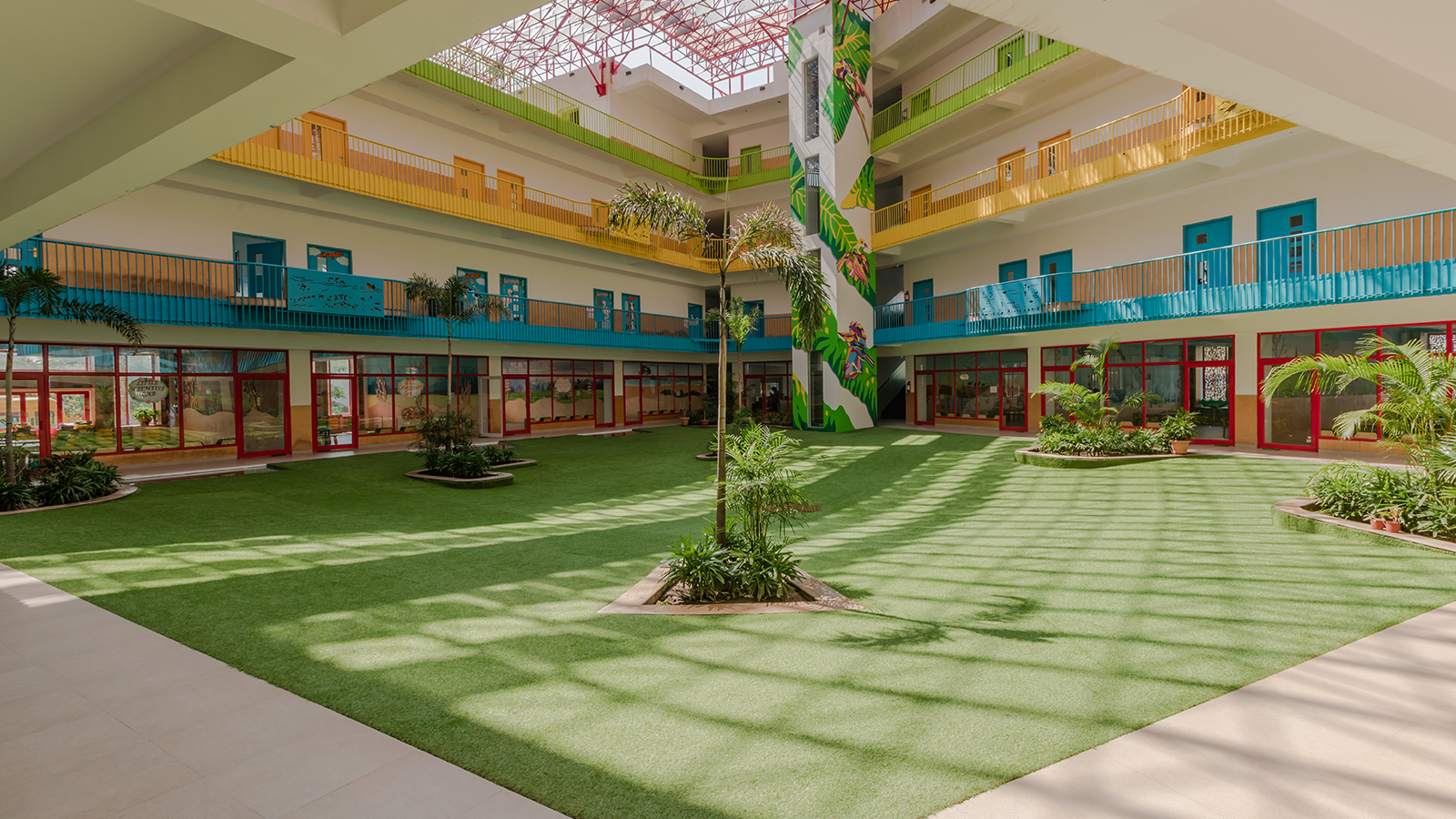 Just like children can’t choose a favourite crayon or colour, the Primary School has abundance of colours used on it’s exterior Facade and Interiors. The Primary School was designed with the principles of using primary colours like Red, Blue, Green and Yellow as children comprehend and relate to those colours the most. A splash of colours is used in the Triangle windows, Louvers and the Balconies in the Central courtyard which colour allotted to each floor. The central courtyard has lush greens and palms with colourful balconies with graffiti on the lift block covered by a red Spaceframe.