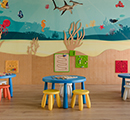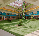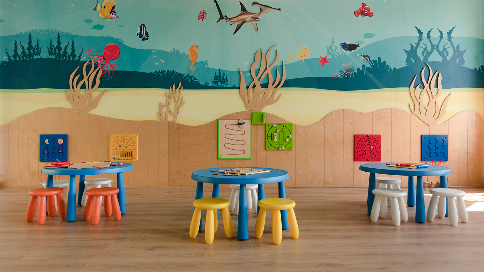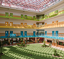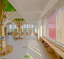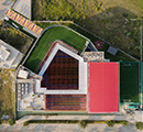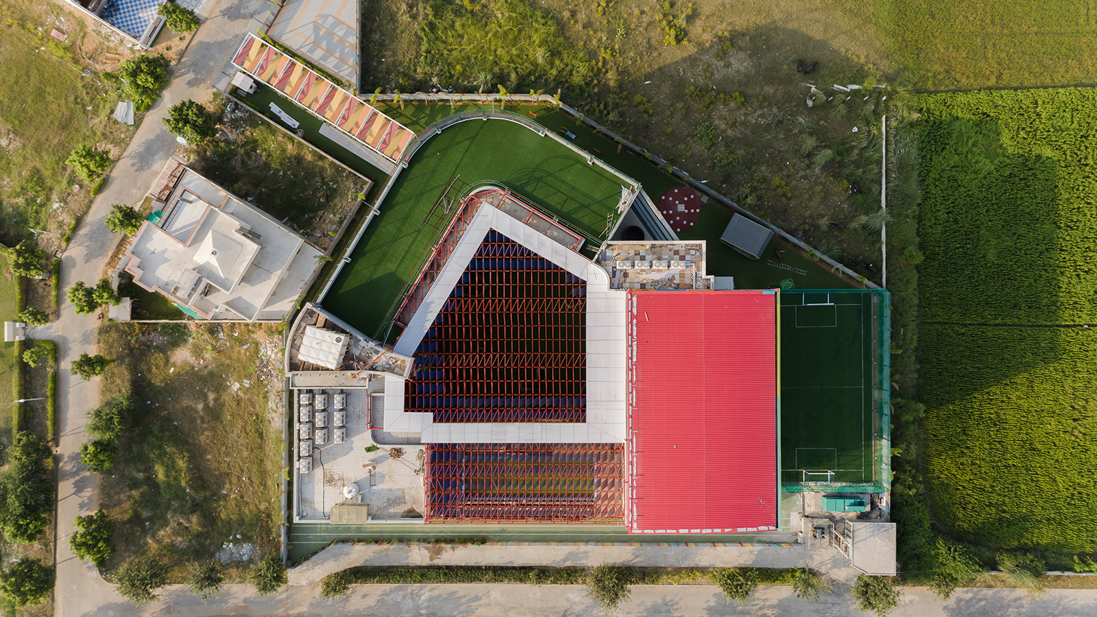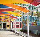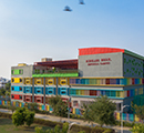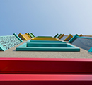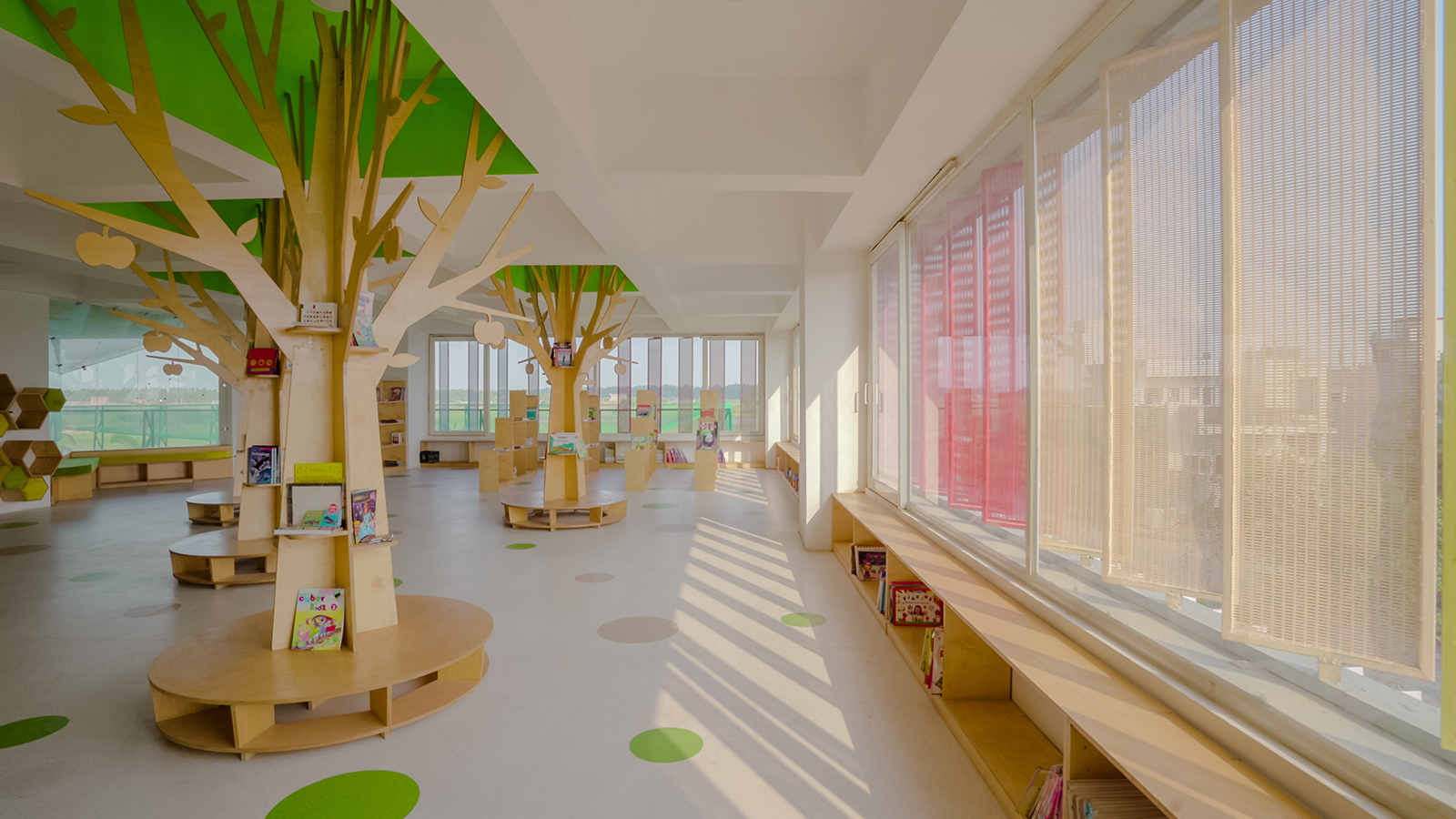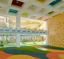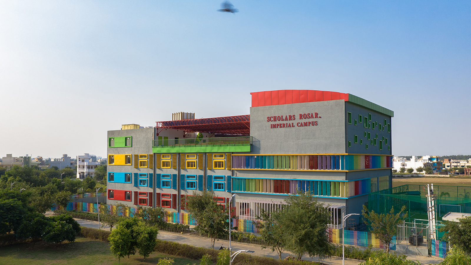 Just like children can’t choose a favourite crayon or colour, the Primary School has abundance of colours used on it’s exterior Facade and Interiors. The Primary School was designed with the principles of using primary colours like Red, Blue, Green and Yellow as children comprehend and relate to those colours the most. A splash of colours is used in the Triangle windows, Louvers and the Balconies in the Central courtyard which colour allotted to each floor. The central courtyard has lush greens and palms with colourful balconies with graffiti on the lift block covered by a red Spaceframe.