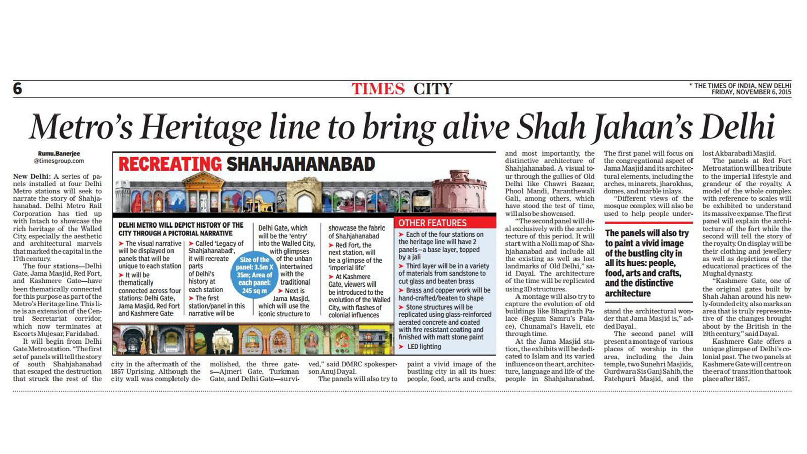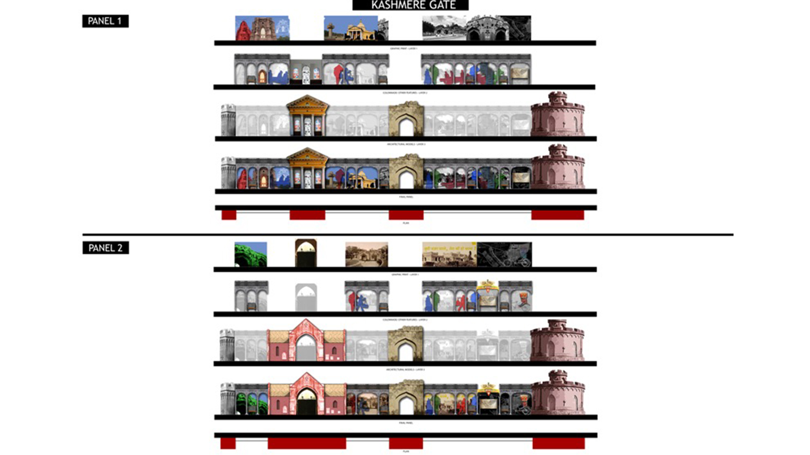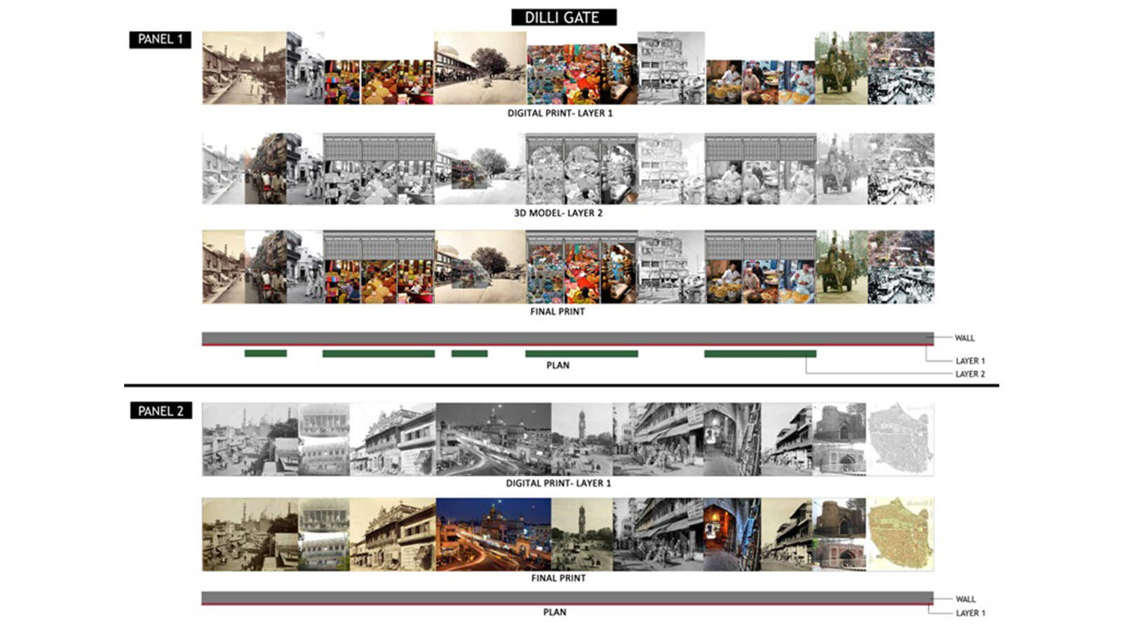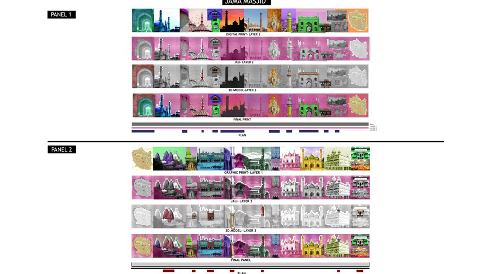 The series of panels are to be installed at four Delhi Metro Stations will seek to narrate the story of Shahjahanabad. The visual narrative will be displayed on panels that will be unique to each station. It will be thematically connected cross four stations: Delhi Gate, Jama Masjid, Red fort and Kashmere Gate. Each of the four stations on the heritage line has 2 panels- a base layer which is topped by jali.